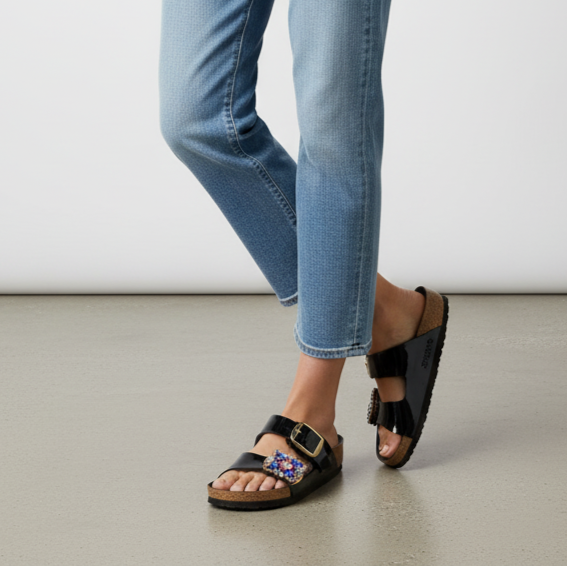 This bonbon is accented with pink and blue gems . It has a black backing and is recommended for any color sandal.