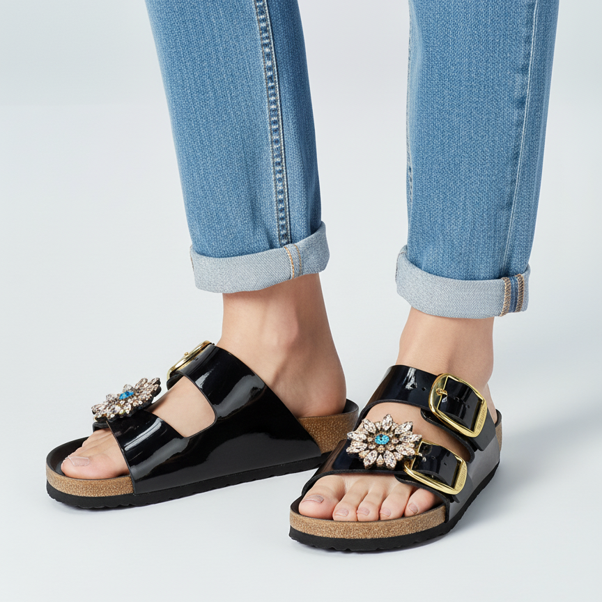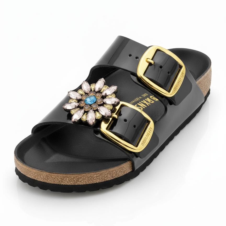 This bonbon is accented with pink, gold and blue gems . It has a black backing and is recommended for any color sandal.